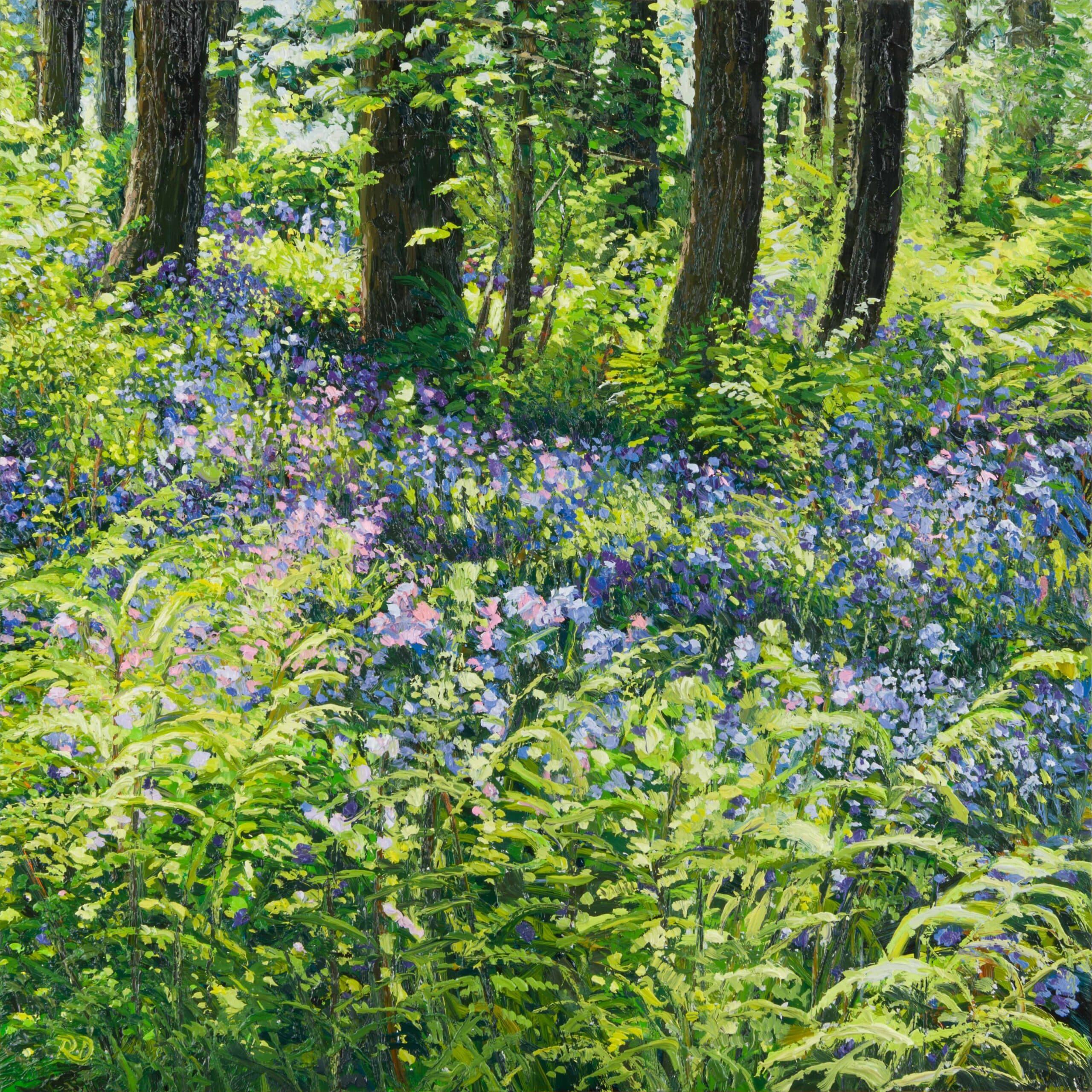 Het frisse licht van de lente op een unieke plek, Wildrijk in Noord-Holland. Wilde Hyacinten in diverse kleuren spelen met het licht dat op de varens valt.